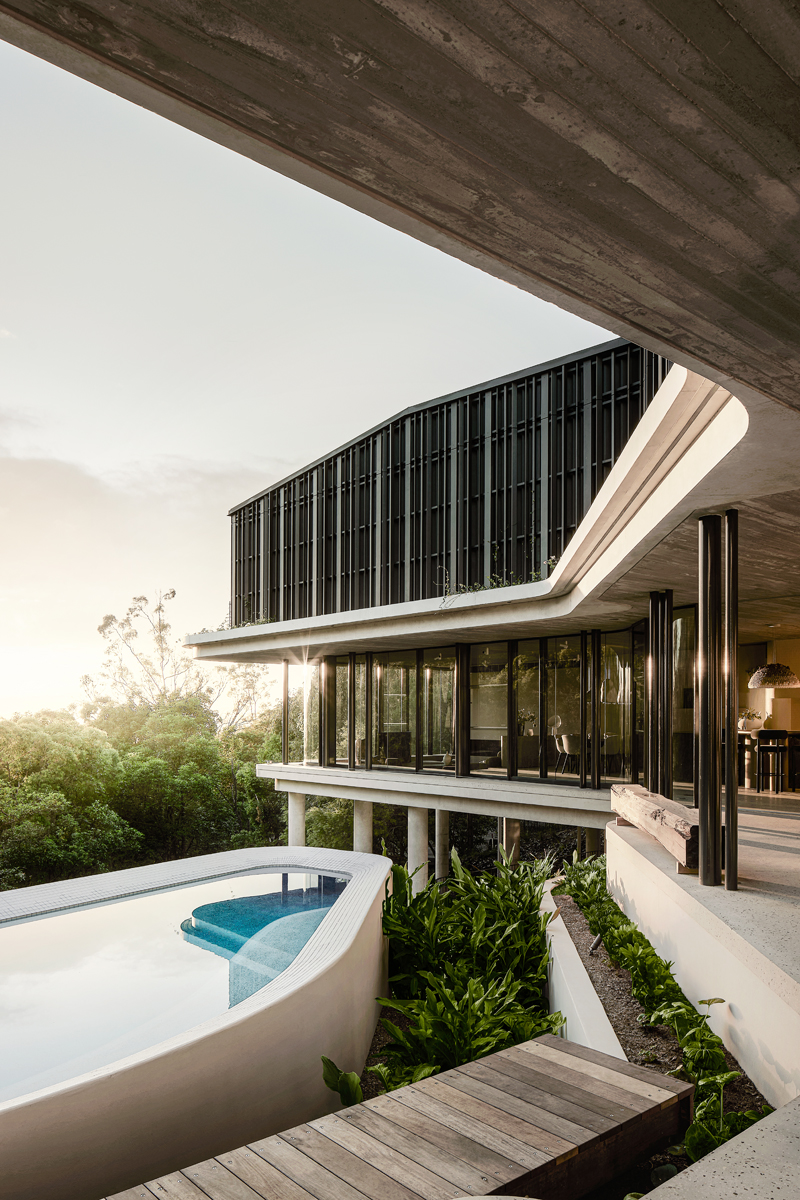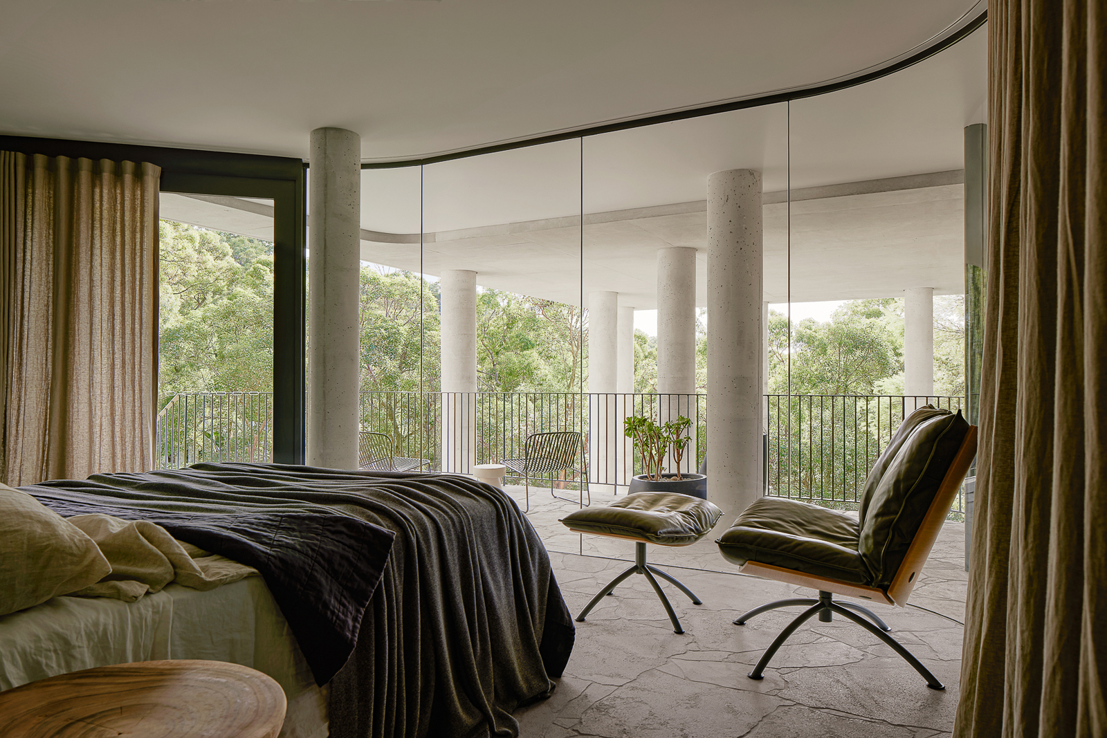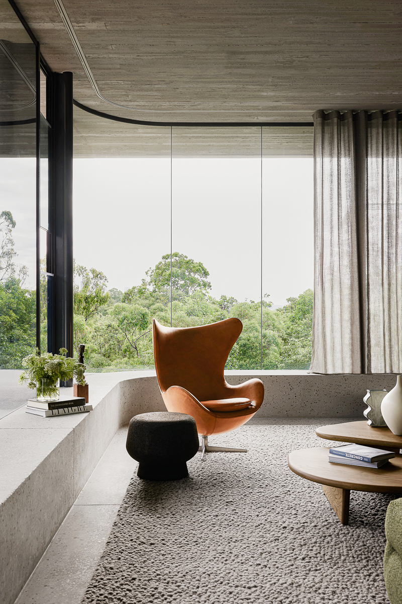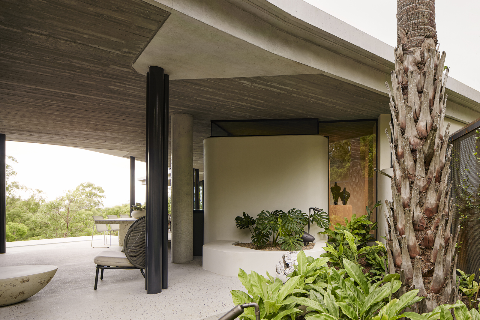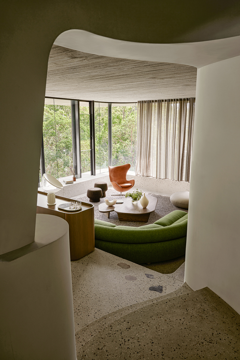 Inspired by the clients’ childhood memories of local creek beds, this home fosters a strong relationship to landscape. The experience of the house mimics nature—hidden entries, shifting light, reflective water and organic materials. Curved walls and rocks form aseries of stepped levels to integrate with the steep terrain, while revegetation transforms the once-barren site. An L shape plan plan bends to capture northern light and key views. The architecture embraces relaxed, honest spaces, blending into the landscape and offering a variety of places for leisure, feasting, lush planting, fragrance, and swimming in a private setting. Completion 2023 Architecture Angus Munro, Sam Bresnehan, Miriam Kuzai, Malakai Smith Interior Louise Walsh Interior Design Structure NGS Structural Engineers Build MCD Constructions Lighting Graylight Landscape Dangar Barin Smith Town Planning Craven Town Planning Photography Brock Beazley
