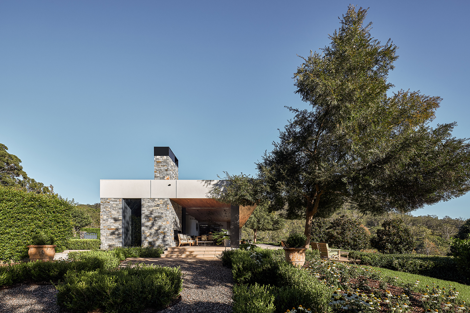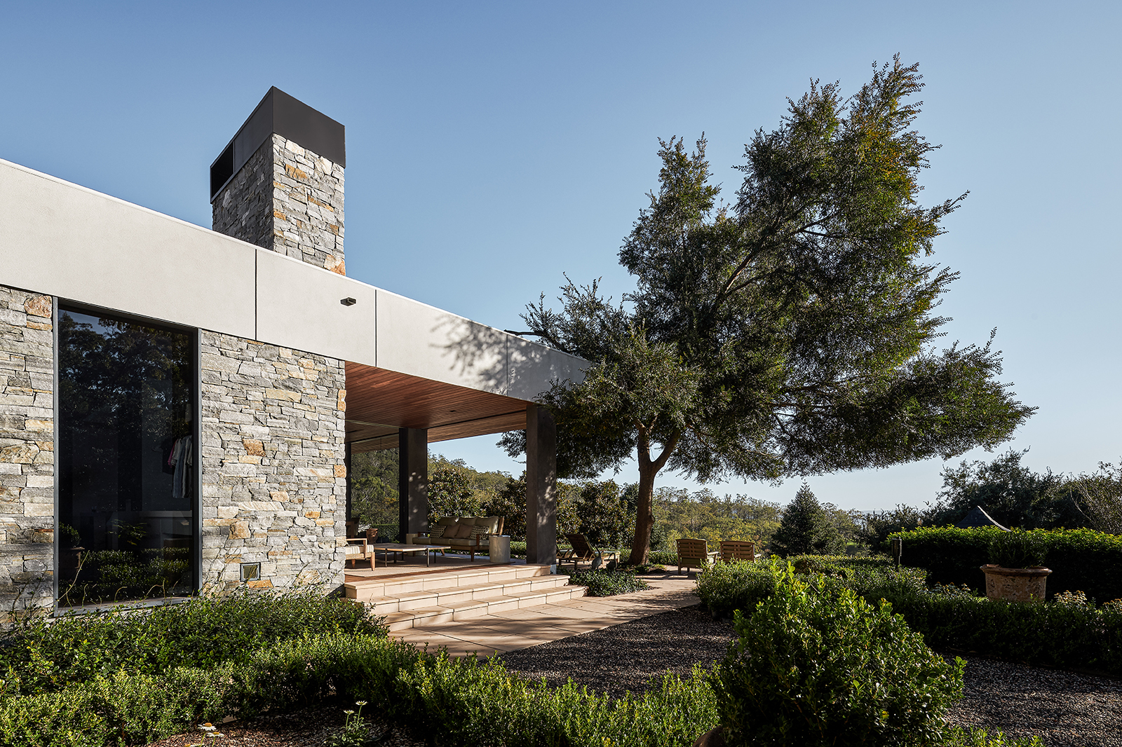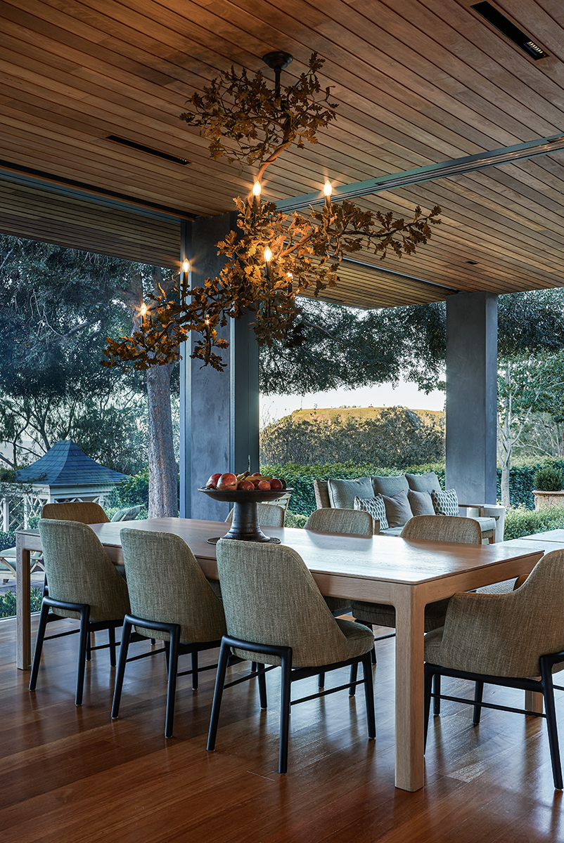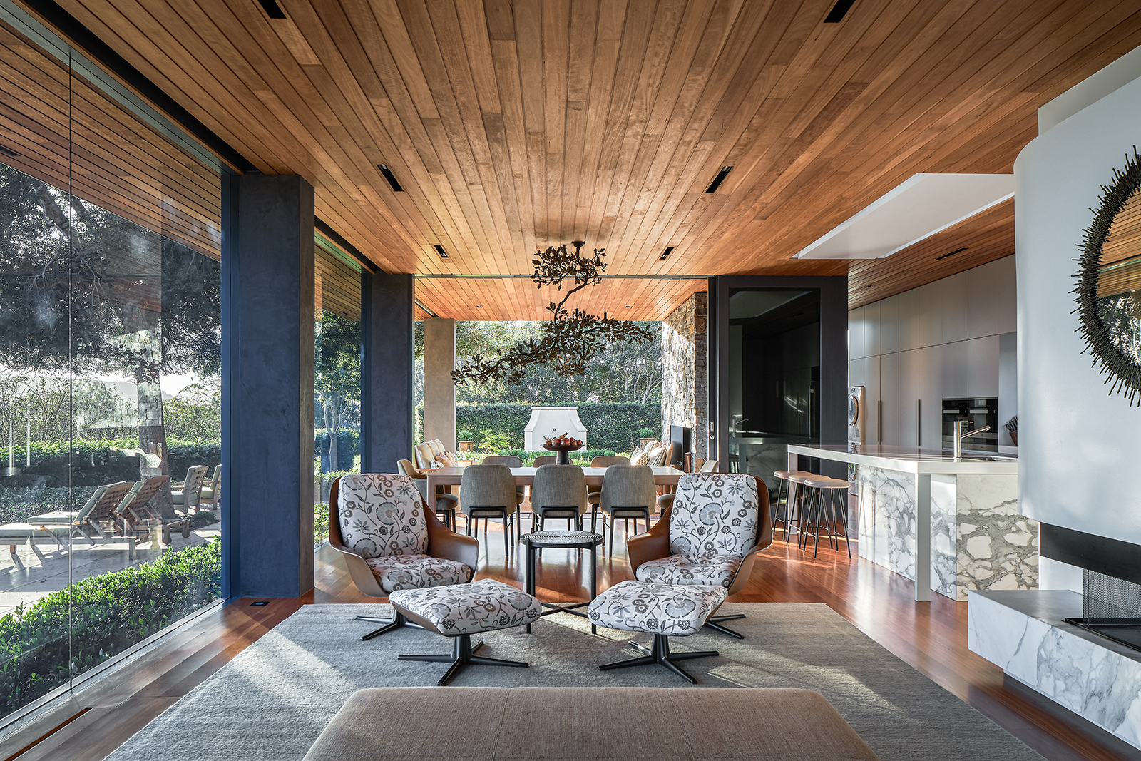 The project strategy was to amplify experiences of the existing garden and distant bushland. The Paul Bangay garden design is based on a symmetrical and axial layout, offering retreat from the surrounding bushland. Traditionally a garden would be surrounded by a loggia, a covered edge space, between the protection of inside and wild exterior. The house is imagined as a loggia to the garden. The new house merges with the existing garden design, but is also the anti-thesis. The gardens are each designed around a focal point; they are autonomous and independent of the setting, while the house is outward looking without a central focal point, and has spaces that overlap and are not autonomous. The building is path of the garden. The walls could be understood as hedges, the ‘stairs’ as waterfalls, chandeliers as fountains, and artwork as flowering plants.