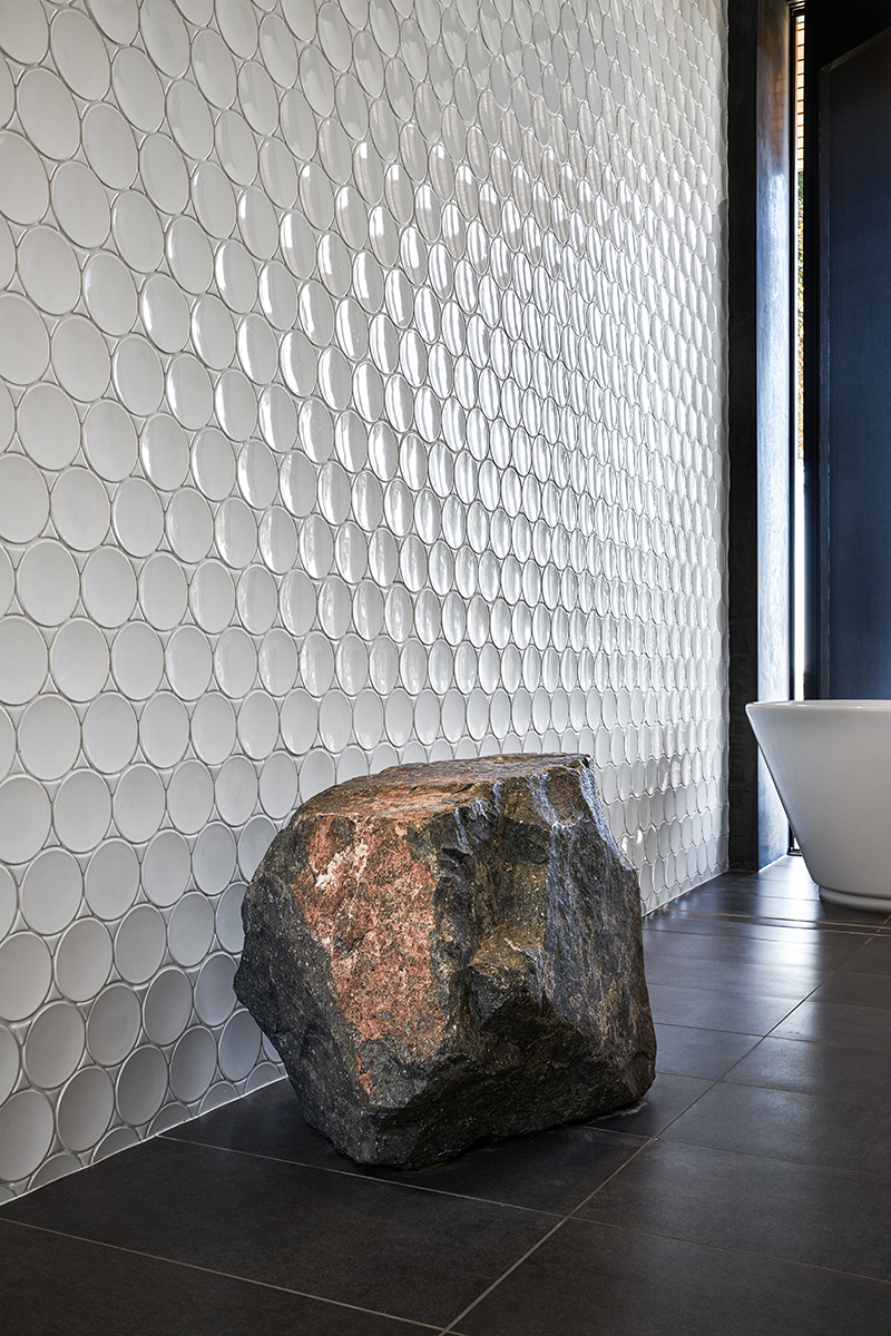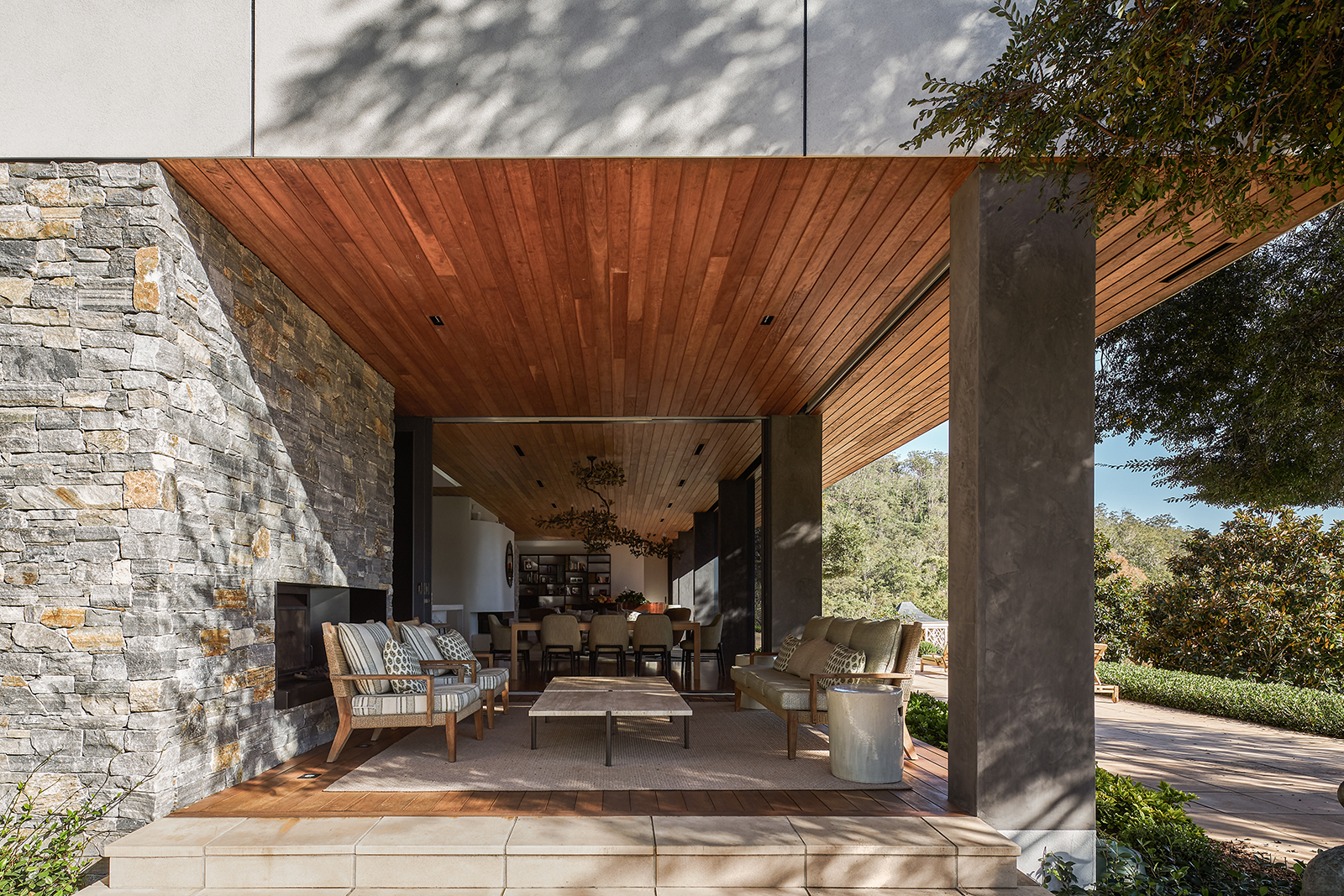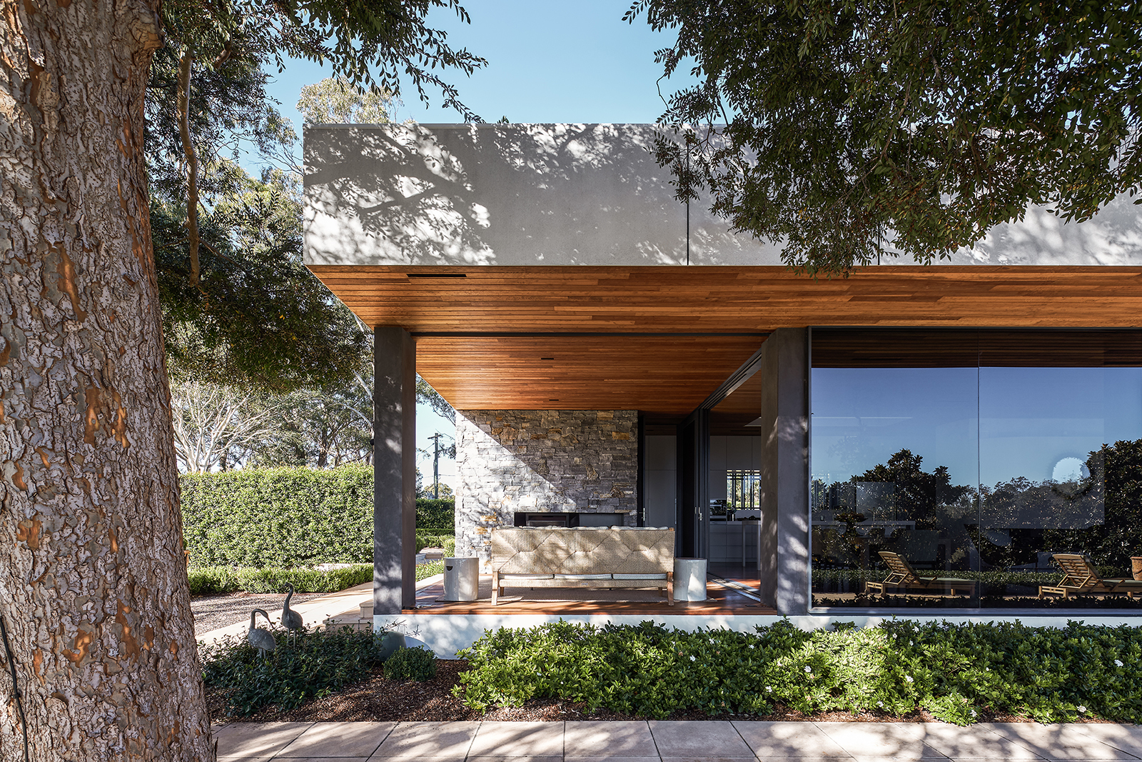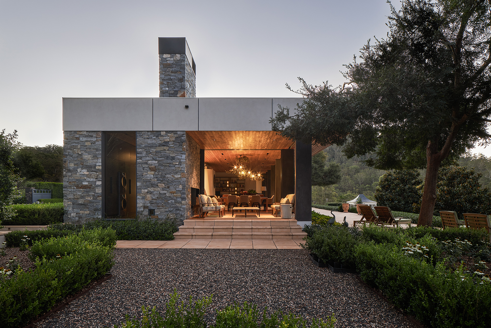 The project strategy was to amplify experiences of the existing garden and distant bushland. The Paul Bangay garden design is based on a symmetrical and axial layout, offering retreat from the surrounding bushland. Traditionally a garden would be surrounded by a loggia, a covered edge space, between the protection of inside and wild exterior. The house is imagined as a loggia to the garden. The new house merges with the existing garden design, but is also the anti-thesis. The gardens are each designed around a focal point; they are autonomous and independent of the setting, while the house is outward looking without a central focal point, and has spaces that overlap and are not autonomous. The building is path of the garden. The walls could be understood as hedges, the ‘stairs’ as waterfalls, chandeliers as fountains, and artwork as flowering plants.