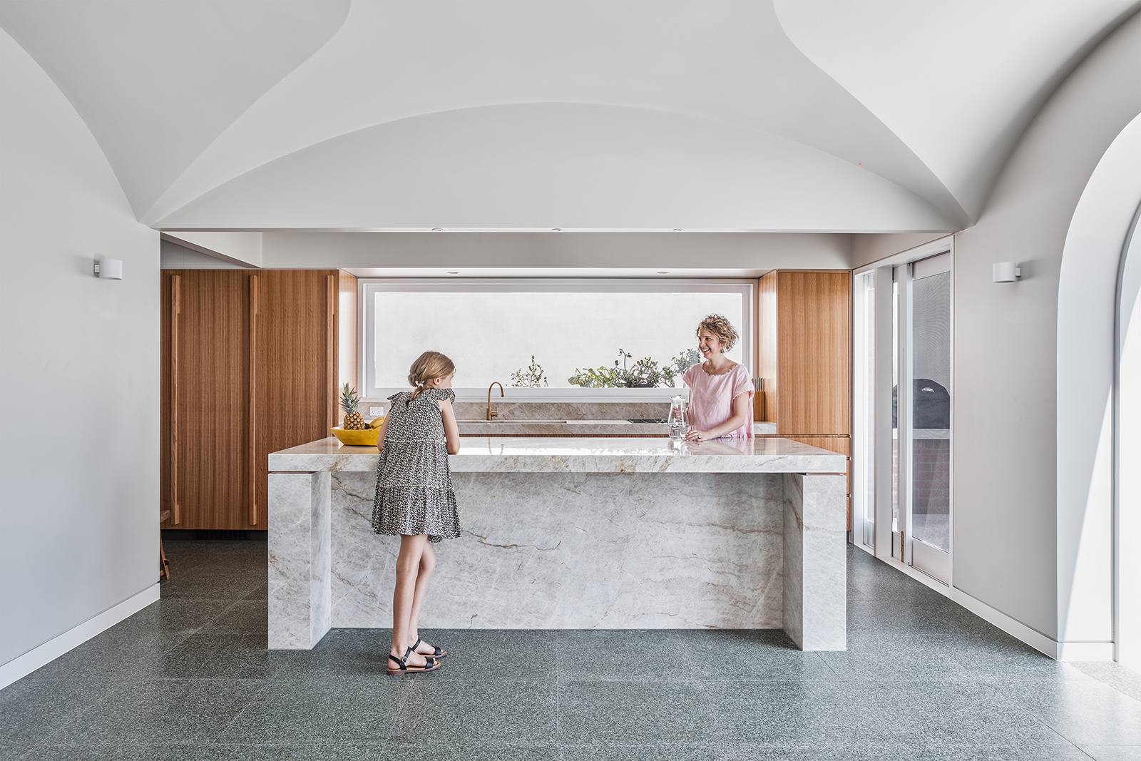 The project strategy was to amplify experiences qualities of the existing house. Additions are bold and responsive to the original house which is stoic and solid, with a series of brick arches. New cladding is inspired by the large round columns on the original portico. The geometry of the existing brick arches are extruded into intersecting vaults, which form the idea for the new living room ceilings. Completion 2018 Architecture Angus Munro, Sam Bresnehan, Olivia Daw, Jessie Spresser, Valentina Ponomariova, Julia Thorpe Structure AD Structures Build Bespoke Constructions Photography Andy MacPherson