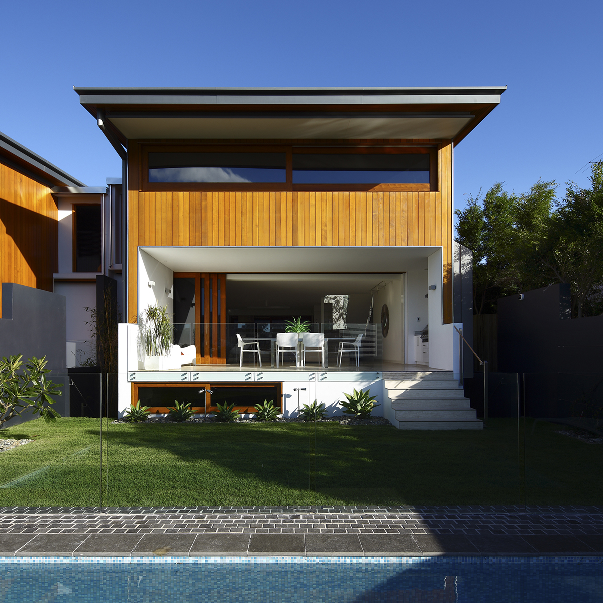 The site has city views to the north and a street aspect to the south. It is adjacent to 3 heritage properties. The elevation is a modern take on the traditional Queensland form, defining base, middle and top. Each town house has open plan living room with fully retractable timber sliding doors, 3 bedrooms with ensuites, a multi use room with ensuite and double car garage. The gardens to the north are raised to give the living a room extra dimension. Completion 2010 Architecture Angus Munro, Craig Channon, Jason Haigh, Ceirwen Burton Structure AD Structure Build Charlie Woodward Photography Scott Burrows