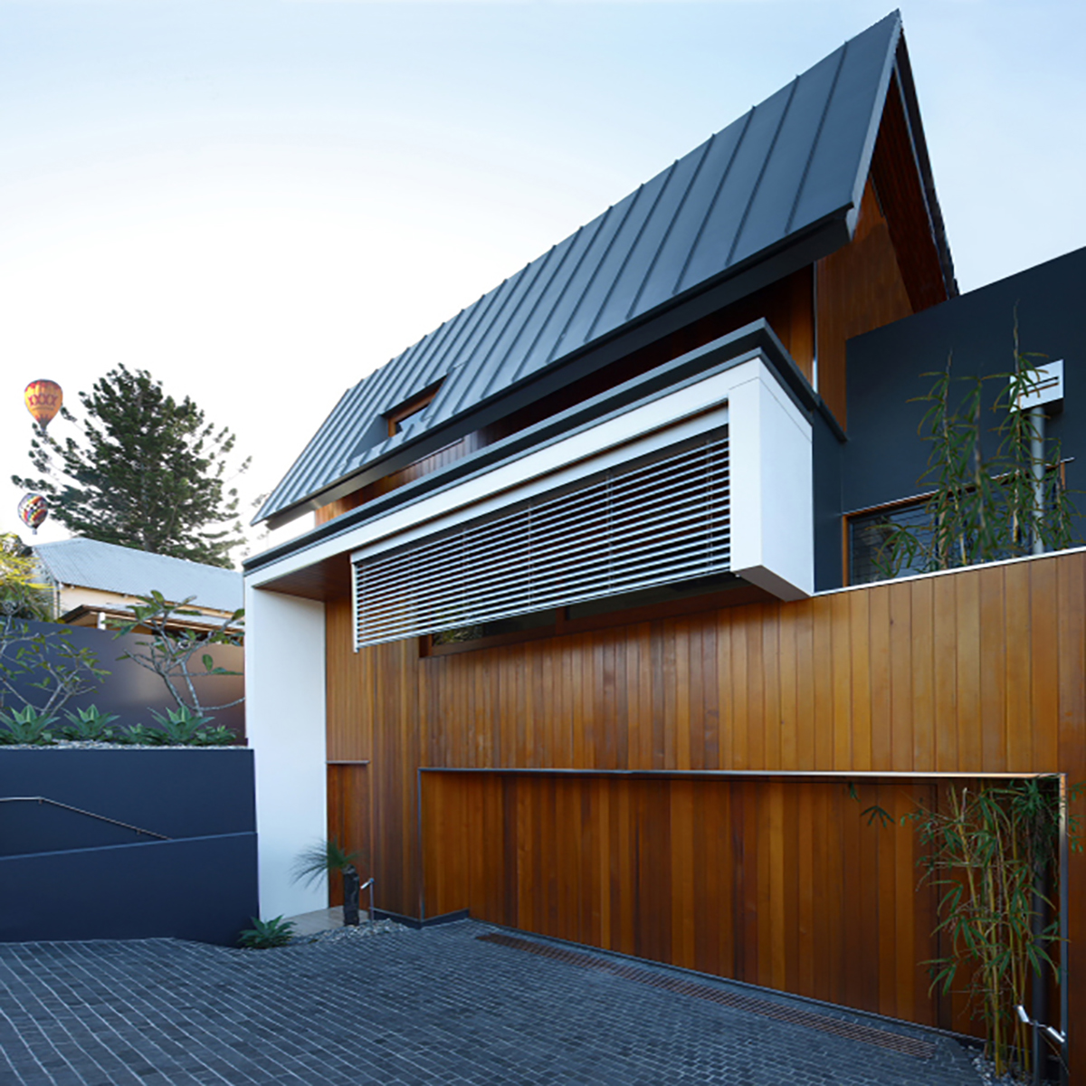 The site has city views to the north and a street aspect to the south. It is adjacent to 3 heritage properties. The elevation is a modern take on the traditional Queensland form, defining base, middle and top. Each town house has open plan living room with fully retractable timber sliding doors, 3 bedrooms with ensuites, a multi use room with ensuite and double car garage. The gardens to the north are raised to give the living a room extra dimension.